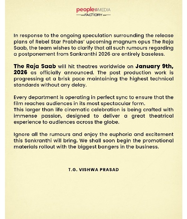 Although it is natural for large movie releases to generate a lot of speculation, the creators of movie are working to inform fans and create a lot of enthusiasm by keeping them updated. In addition, “The Raja Saab” will indeed be released in theaters on schedule; therefore, everyone can look forward to watching the movie when it comes out on the big screen.